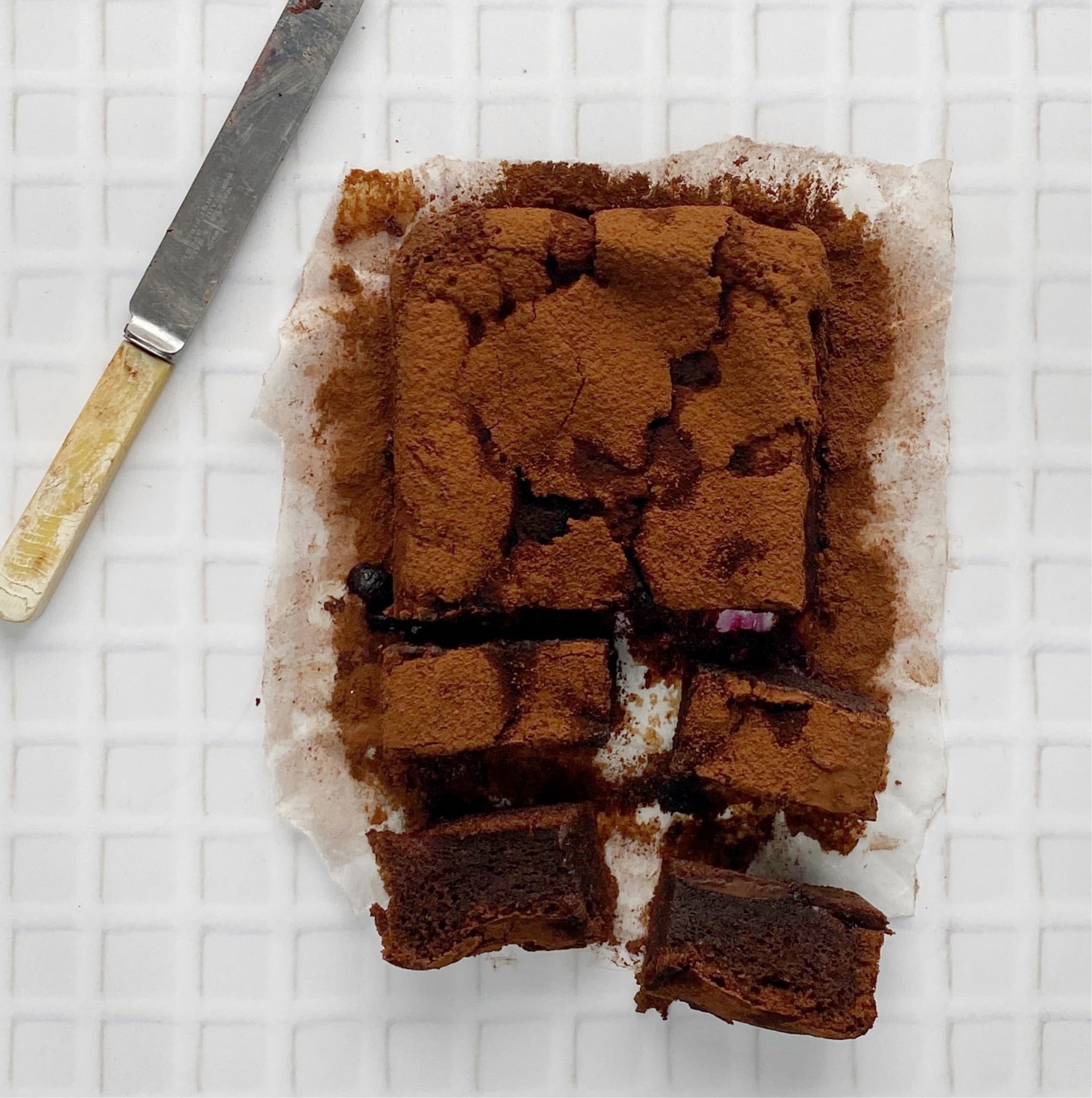 Eggs, butter (milk), dark chocolate [soy lecithin], dark couverture chocolate [soy lecithin], blackberry, blueberry, wheat flour, baking powder.